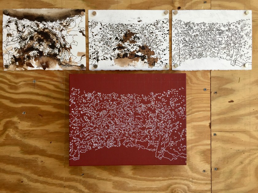 Bailly began the process of incorporating the Cutler Fossil Site into his work in December 2015, through an oil sketch and three small works on paper. Bailly then transferred his drawing onto a large canvas in the Carriage House Studio at the Deering Estate.