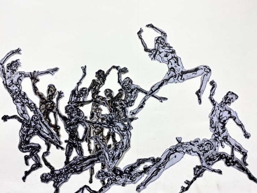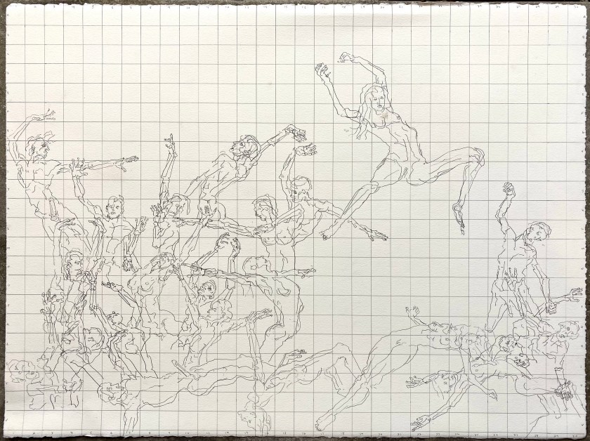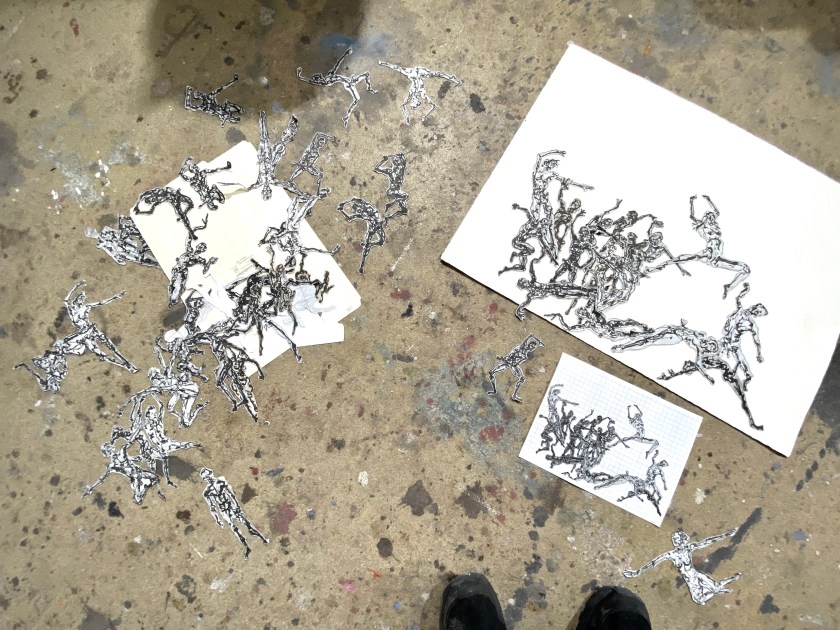 Bailly makes Paper Doll cutouts of his figure drawings. He then moves these Paper Dolls around, exploring compositional possibilities. Once Bailly finds the composition that works for him, he photographs the Dolls on a white background and prints out the photo. Bailly then produces loose contour drawings of the composition. The drawing is then scaled up in drawing to the large canvas, as seen in the Early State of Tequesta Leading the People below.