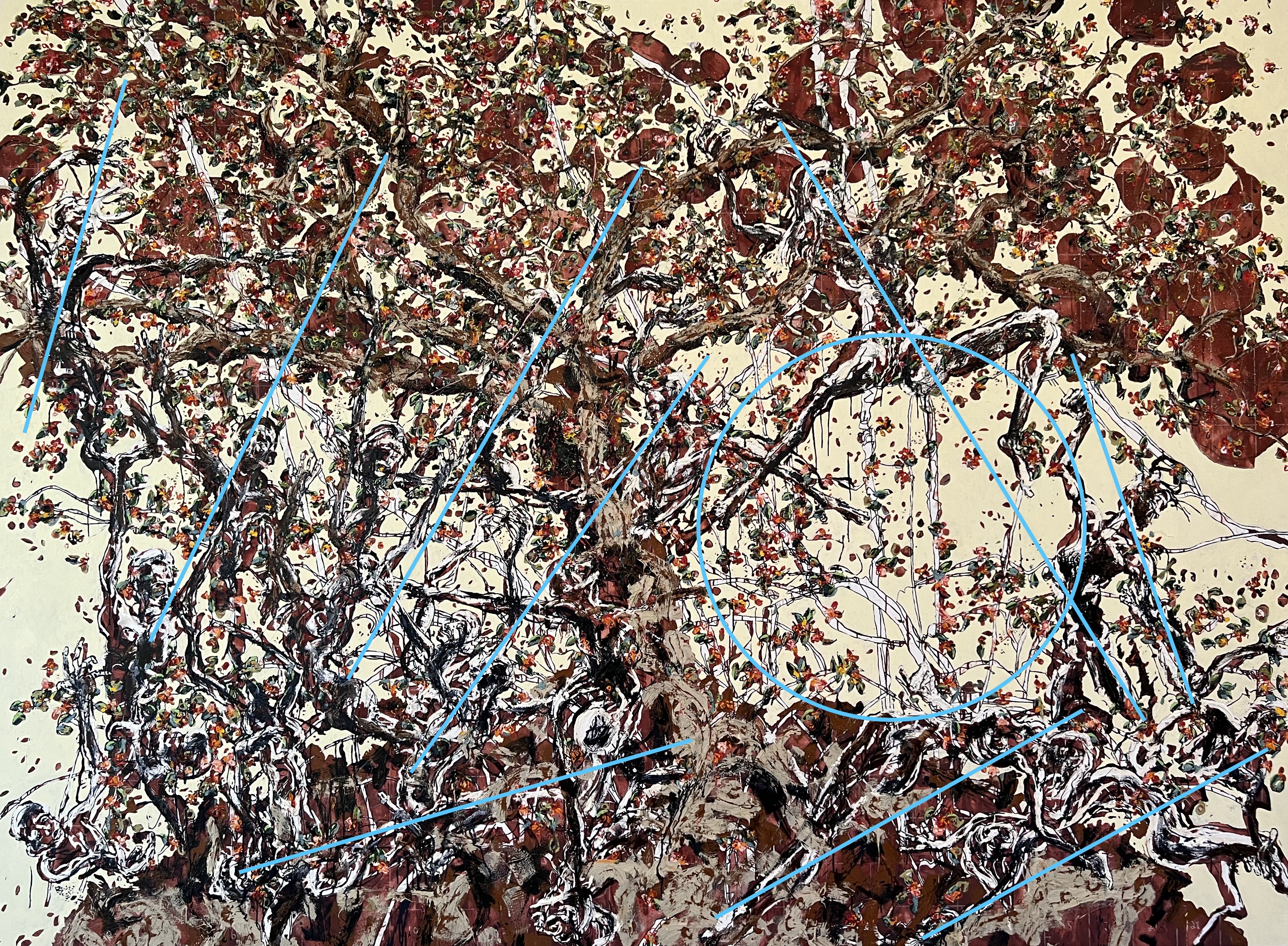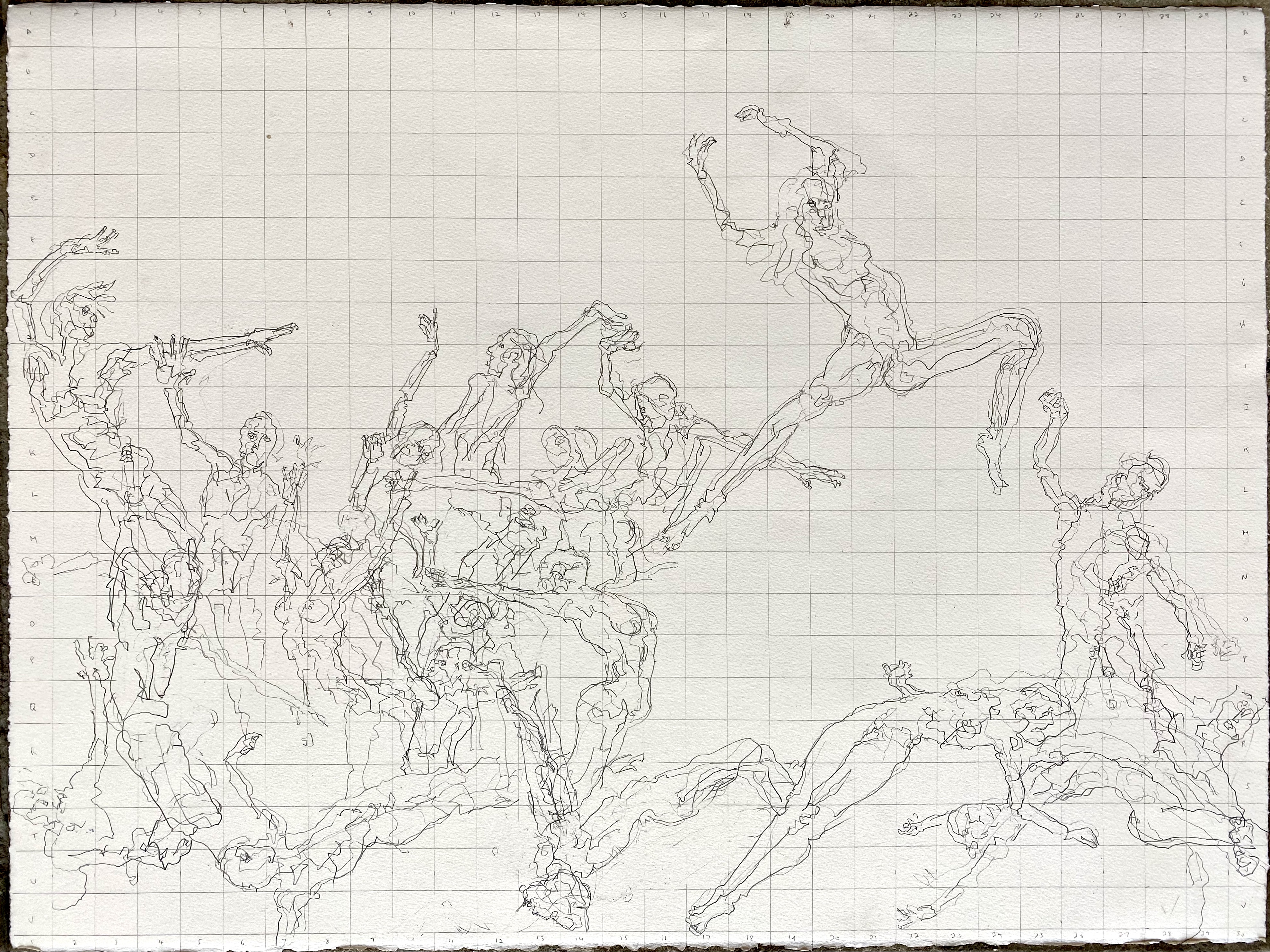Bailly makes Paper Doll cutouts of his figure drawings. He then moves these Paper Dolls around, exploring compositional possibilities. Once Bailly finds the composition that works for him, he photographs the Dolls on a white background and prints out the photo. Bailly then produces loose contour drawings of the composition. The drawing is then scaled up in drawing to the large canvas, as seen in the Early State of Tequesta Leading the People below.