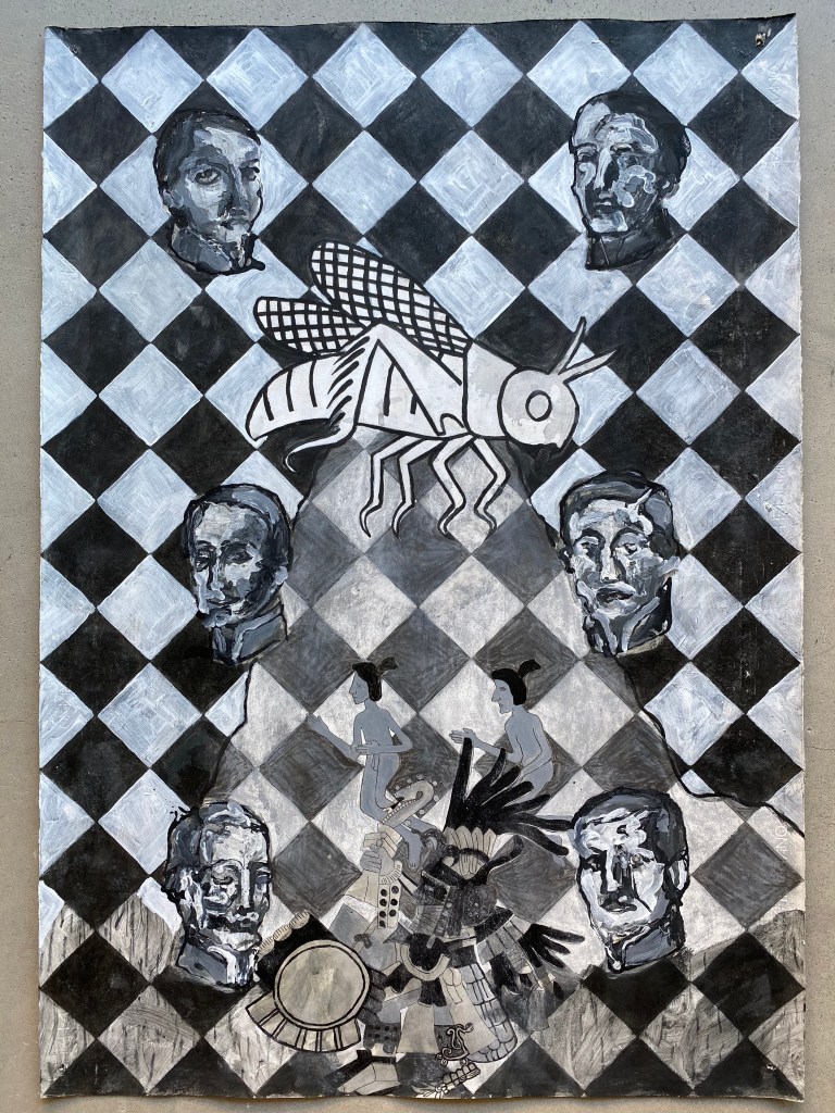 “Mexico contains larger works on paper in a wide variety of mediums, reflecting Bailly’s sentiment during an extended stay in Mexico, with painter Alfredo Gisholt and his brother Pablo. Images juxtapose deities of Pre-Columbian cultures with conquistadors that devastated those same populations. The lens with which Bailly experienced Mexico comes out in these multifaceted, one of a kind drawings.” Sofia Guerra, Curator of Process