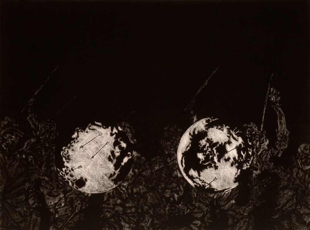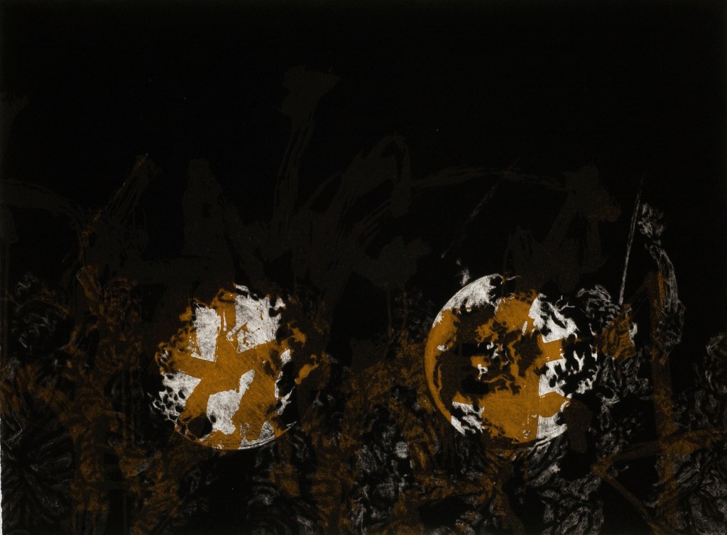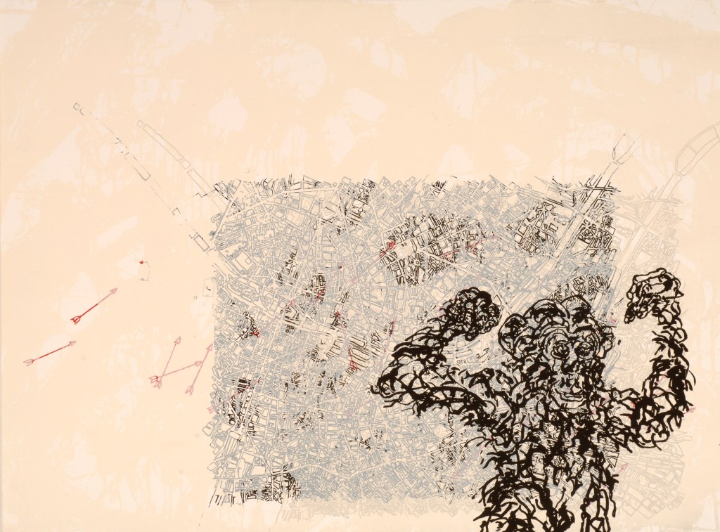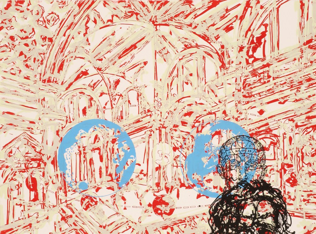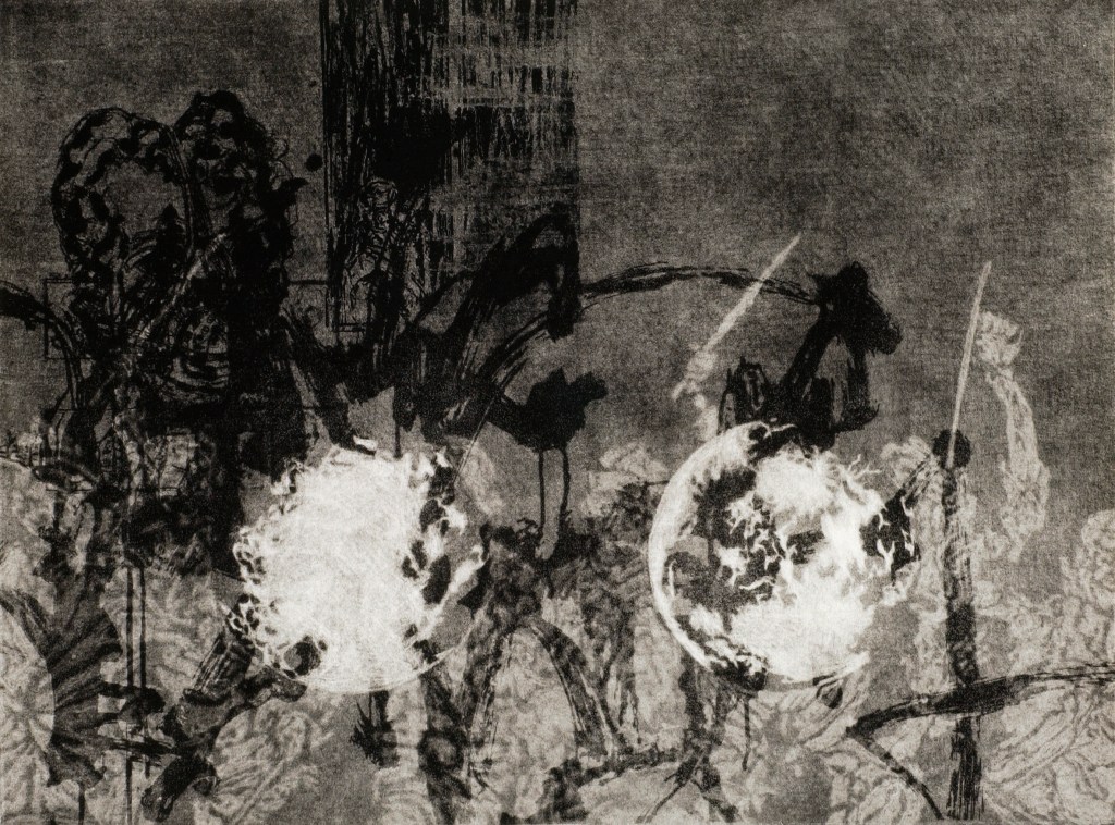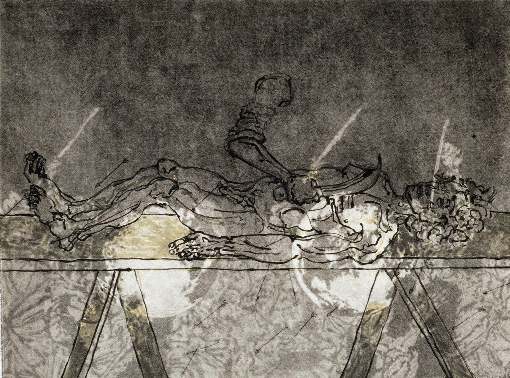 “This drawer holds a series of monoprints that all confront the animal within the humans. Scenes of uprising lay between one-of-a-kind prints a colonizer’s mind, using a massive architectural reminiscent of an ancient Basilica as a backdrop.. A primate’s portrait makes repeated appearances at different points throughout this visual narrative to reaffirm its position as a common ancestor for both the colonizers, and the colonized. While a rhythm is created with the repetition of motifs, no two prints are the same. Each print was inked with its own unique coloring, and each print acts as a standalone piece. These prints were done at Texas State University in San Marcos, under the direction of Professor Jeff Dell and the assistance of his students.” Sofia Guerra, Curator of Process