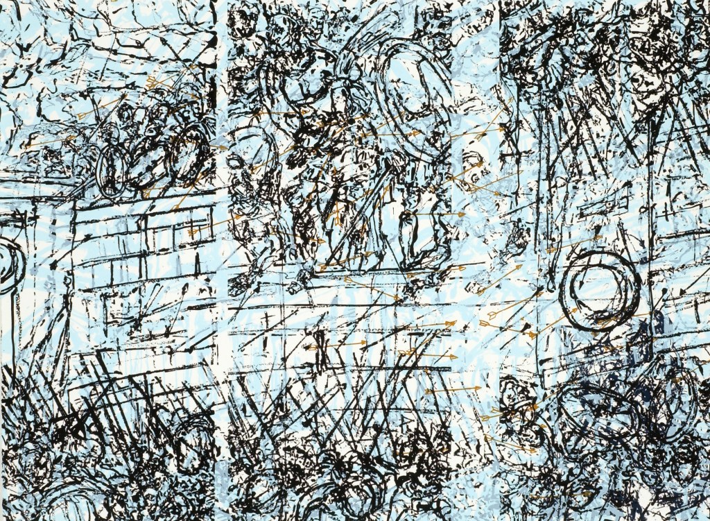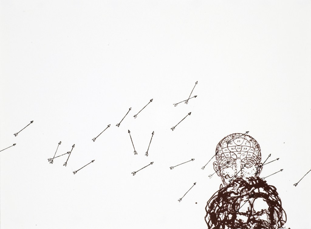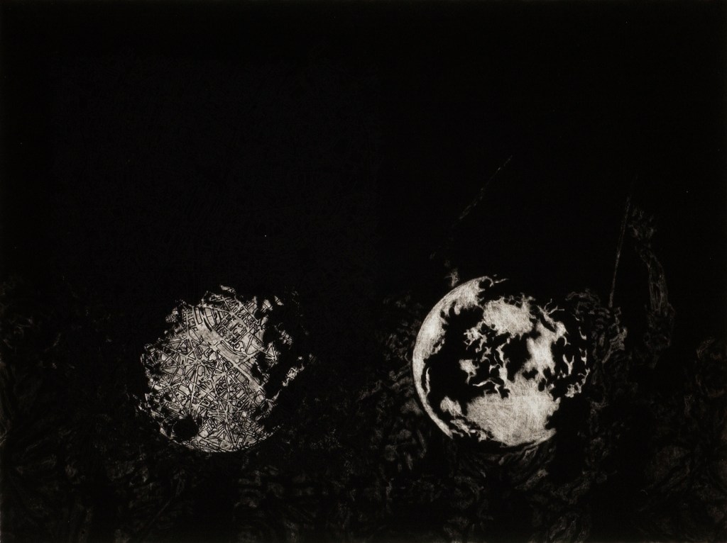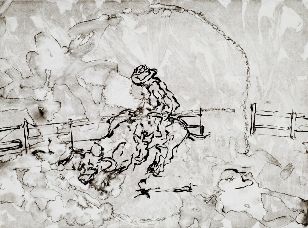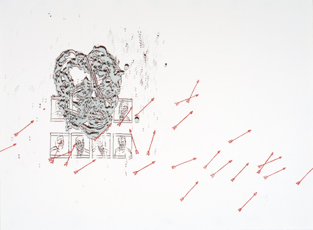 “This drawer holds a series of monoprints that all confront the animal within the humans. Scenes of uprising lay between one-of-a-kind prints a colonizer’s mind, using a massive architectural reminiscent of an ancient Basilica as a backdrop.. A primate’s portrait makes repeated appearances at different points throughout this visual narrative to reaffirm its position as a common ancestor for both the colonizers, and the colonized. While a rhythm is created with the repetition of motifs, no two prints are the same. Each print was inked with its own unique coloring, and each print acts as a standalone piece. These prints were done at Texas State University in San Marcos, under the direction of Professor Jeff Dell and the assistance of his students.” Sofia Guerra, Curator of Process