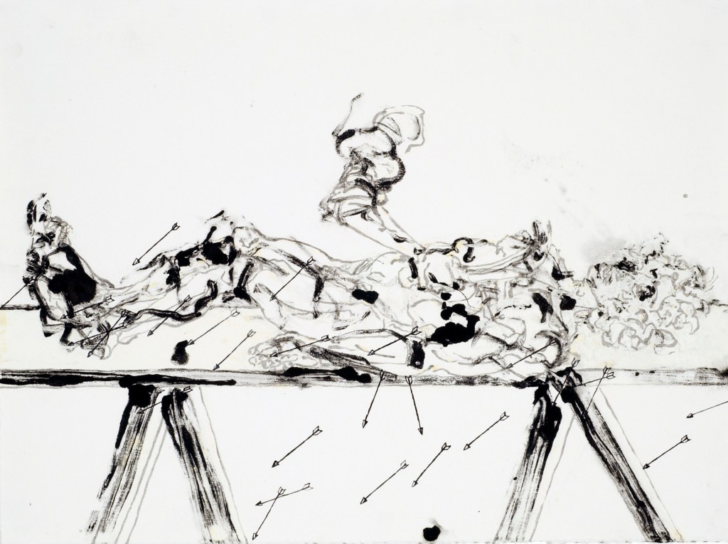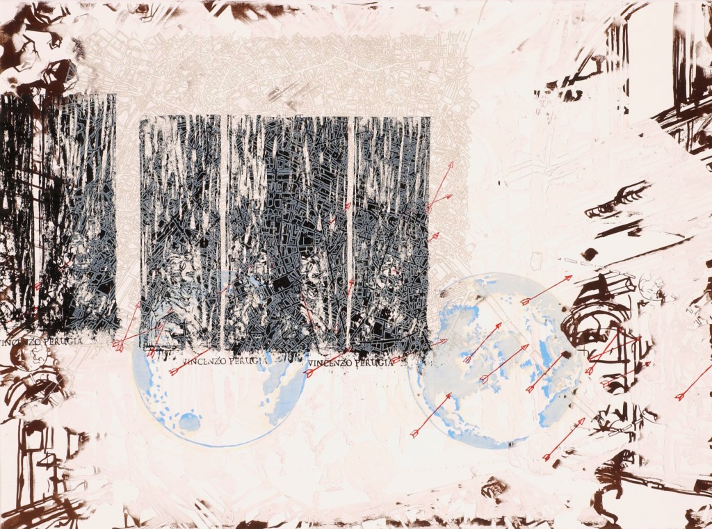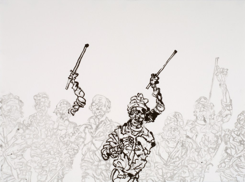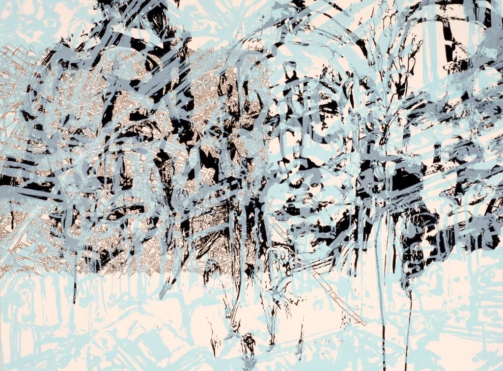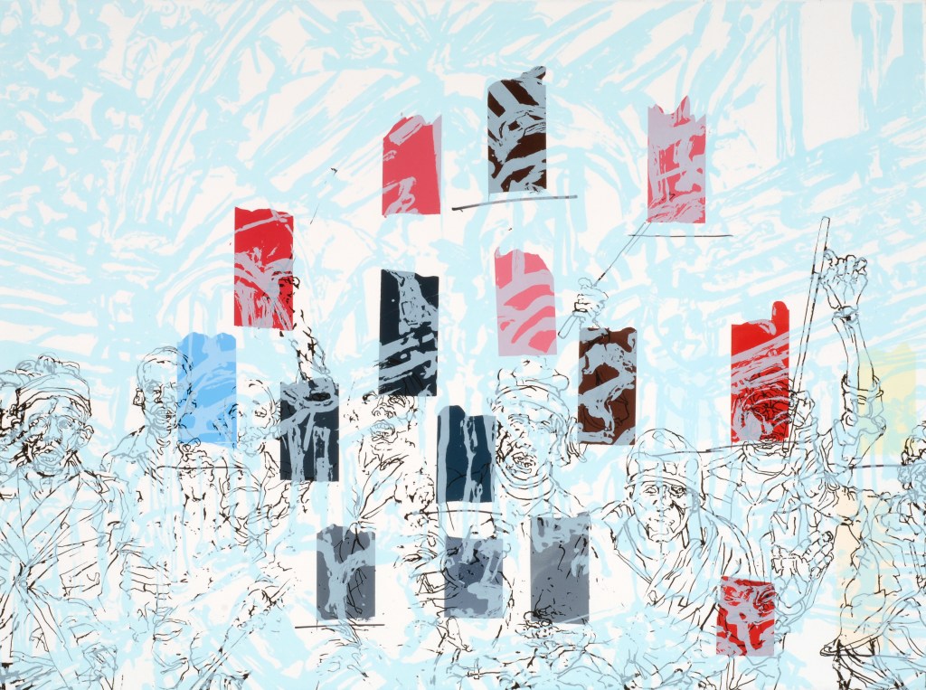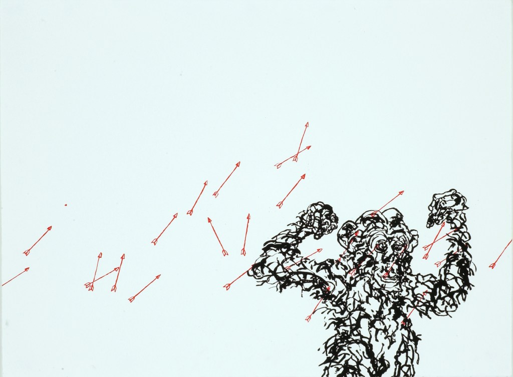 “This drawer holds a series of monoprints that all confront the animal within the humans. Scenes of uprising lay between one-of-a-kind prints a colonizer’s mind, using a massive architectural reminiscent of an ancient Basilica as a backdrop.. A primate’s portrait makes repeated appearances at different points throughout this visual narrative to reaffirm its position as a common ancestor for both the colonizers, and the colonized. While a rhythm is created with the repetition of motifs, no two prints are the same. Each print was inked with its own unique coloring, and each print acts as a standalone piece. These prints were done at Texas State University in San Marcos, under the direction of Professor Jeff Dell and the assistance of his students.” Sofia Guerra, Curator of Process