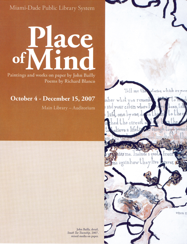 There are experiences that, on the surface, seem to have nothing to do with each other. What would the troop movements in World War II have to do with the street energy of Little Havana, or with clouds, or with the words of a dying father? But when poet Richard Blanco and artist John Bailly collaborated to make this exhibition by setting their work into conversation, the maps early explorers made began to echo with the bright red “U” of the atomic bombs, to echo with the lattice of street maps and with cloud drift–even “Quantum Theory” resembles a love letter, resembles the state of exile.